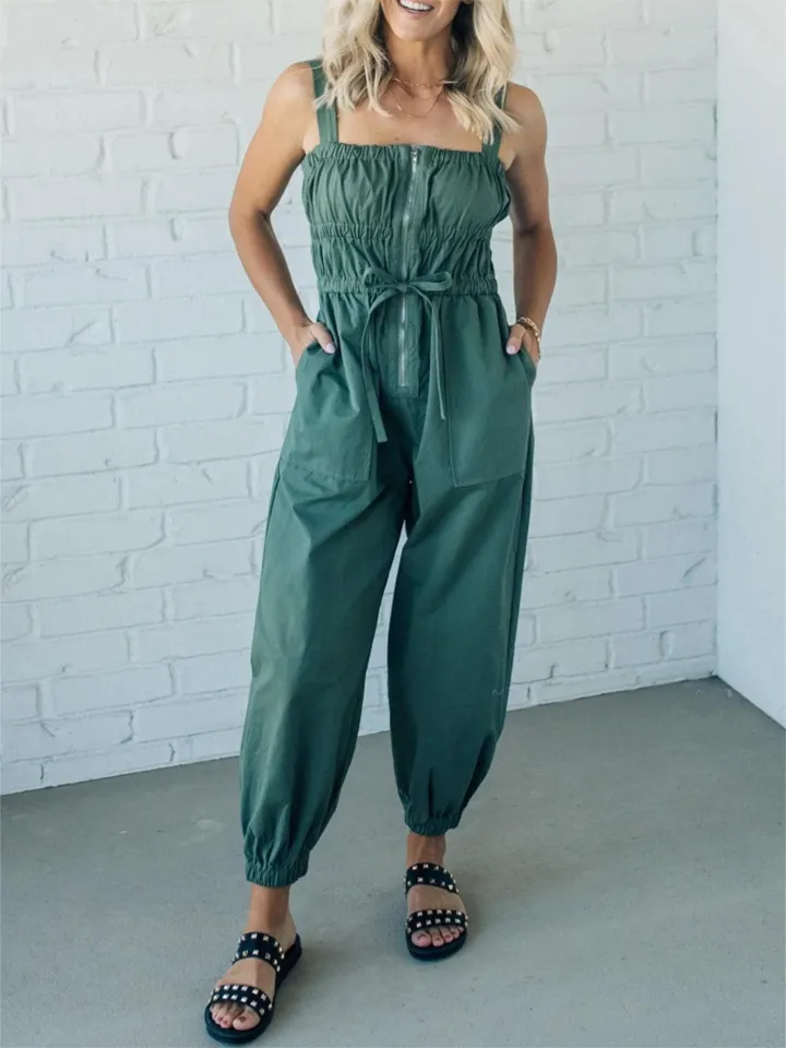 GATHERED ELASTIC FRONT ZIP CARGO JUMPSUIT