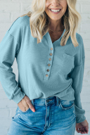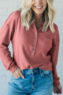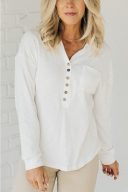 Lightweight top with ribbed details throughout, and collared henley neckline. The cozy fit, contrasted with classic button front polo buttons and collar are a perfect match to give a classy take on a cozy boyfriend tee. Features a low, dropped shoulder, and multi-button front collar.
