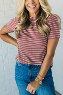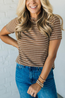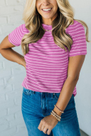 Experience the perfect balance of style and comfort with our Hannah Striped Ribbed Tee. Featuring a classic crew neck design and loose fit, this tee is made with a ribbed texture for a modern twist. The horizontal stripes add a touch of playfulness to your wardrobe. Stay stylish and comfy all day long!