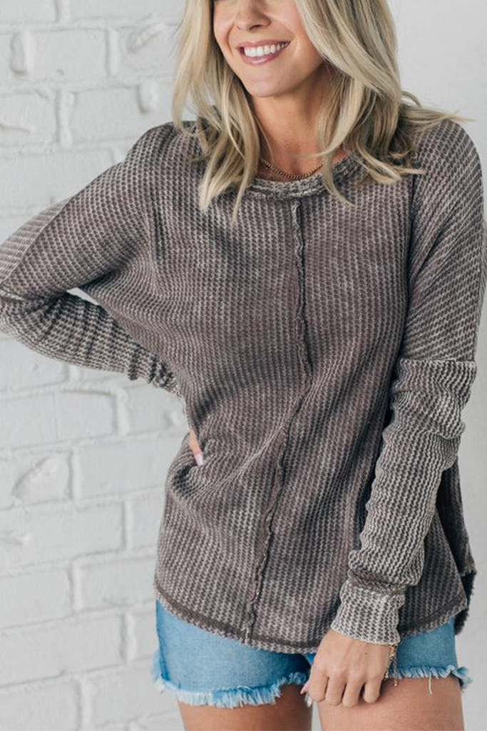 Mid-weight, durable quality acid washed top, with long sleeves and a classic round neckline. The longer length and oversized fit make this an ideal cozy option to pair with leggings or jeans! Not lacking in texture or detail, the raw edges, and exposed seam highlight the textured details!