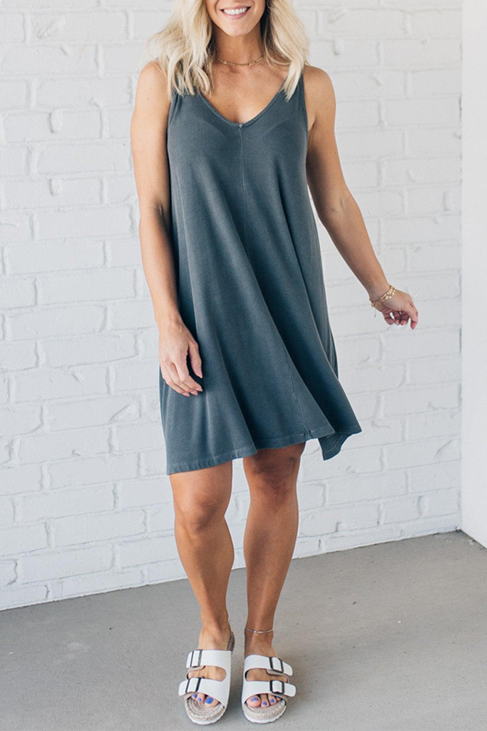 Look fantastic in this super soft Ribbed Shift Dress! Its mineral wash and slim ribbed texture caress your curves, while the flattering deep V-neck and knee-length skirt will make those legs look legendary! Comfort never looked so good!