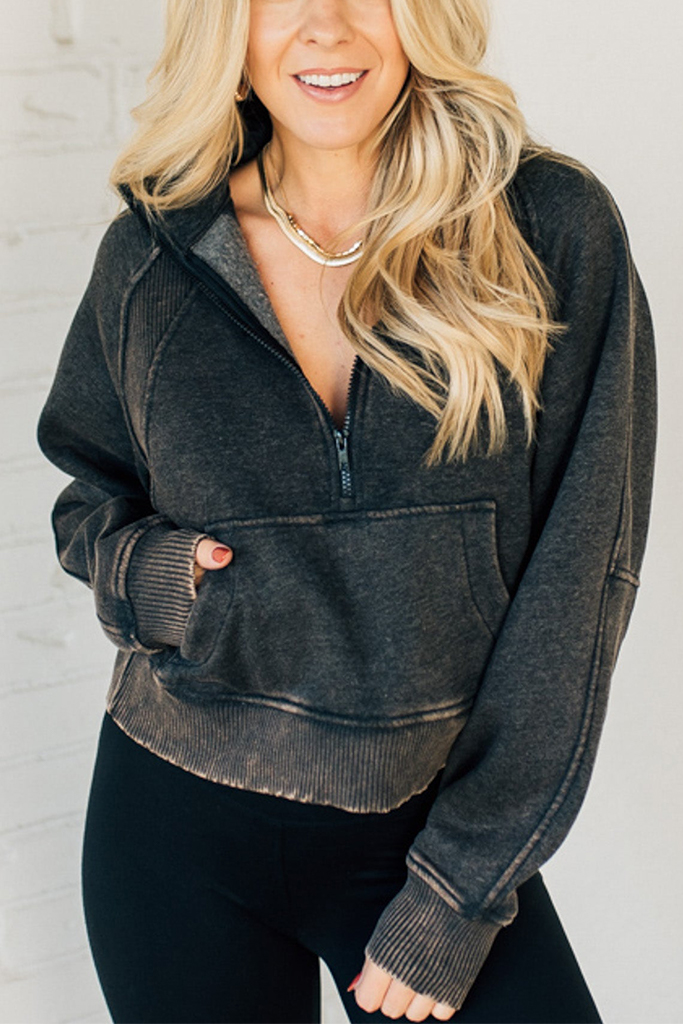 Get ready to snuggle up in this Rory Ribbed Half Zip Pullover! With its cozy fleece lining and worn-on feel, this crop length pullover is perfect for a chilly day. The ribbed panel accents and statement collar add a touch of style, while the mineral wash detail finish and front kangaroo pocket provide functionality. Stay warm and stylish with Rory!